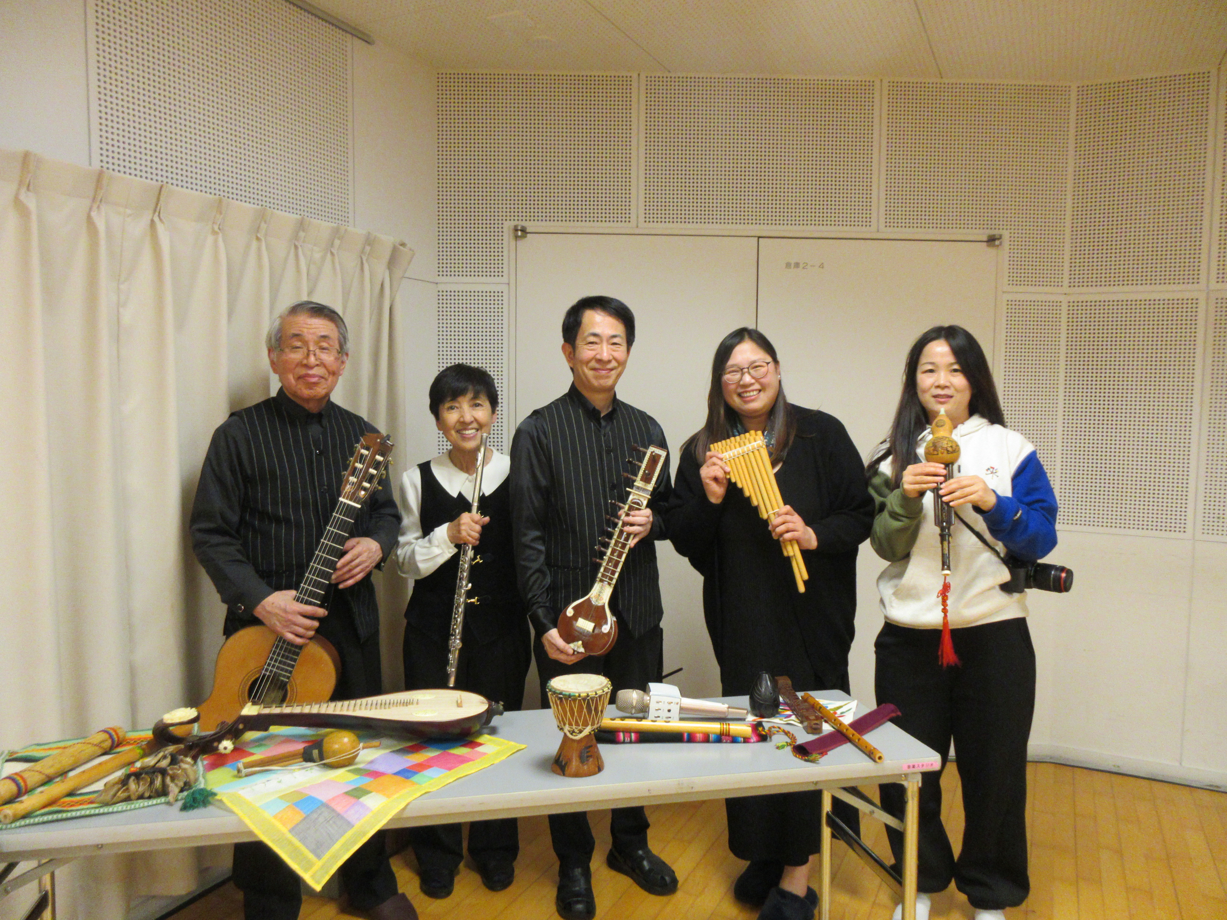 令和8年2月8日アバンセ2階音楽スタジオにて「国際ワールドツアー」~世界の音楽で旅してみよう!~を開催しました。今回は「アンサンブル パストラーレ」のみなさんが演奏してくださり、パネルディスカッションのパネリストで中国出身の銭さんが歌の披露をしてくださいました。